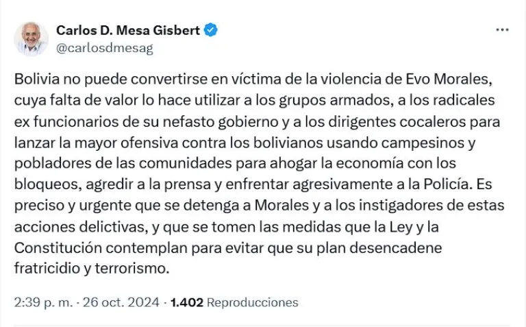 “Bolivia no puede convertirse en víctima de la violencia de Evo Morales, cuya falta de valor lo hace utilizar a los grupos armados, a los radicales ex funcionarios de su nefasto gobierno y a los dirigentes cocaleros para lanzar la mayor ofensiva contra los bolivianos”, escribió Mesa en su cuenta de X.
