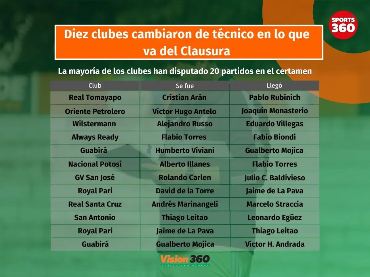 En lo que va del Torneo Clausura diez clubes cambiaron de técnico. Royal Pari y Guabirá lo hicieron dos veces.