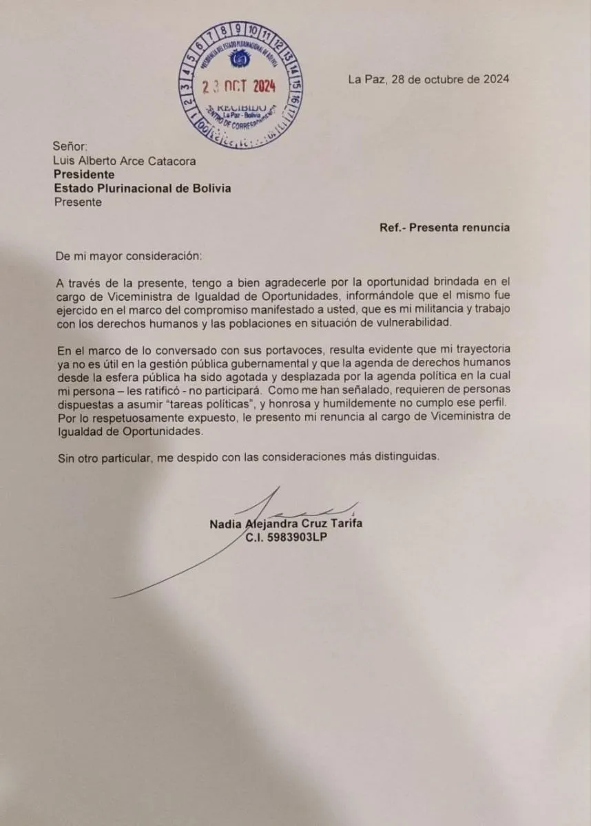 Nadia Cruz, la exdefensora del Pueblo en el gobierno de Evo Morales, renunció este lunes a su cargo de Viceministra de Igualdad de Oportunidades alegando que ella no cumple el perfil que quiere ahora el Gobierno para realizar “tareas políticas” y no de defensa de los derechos humanos.