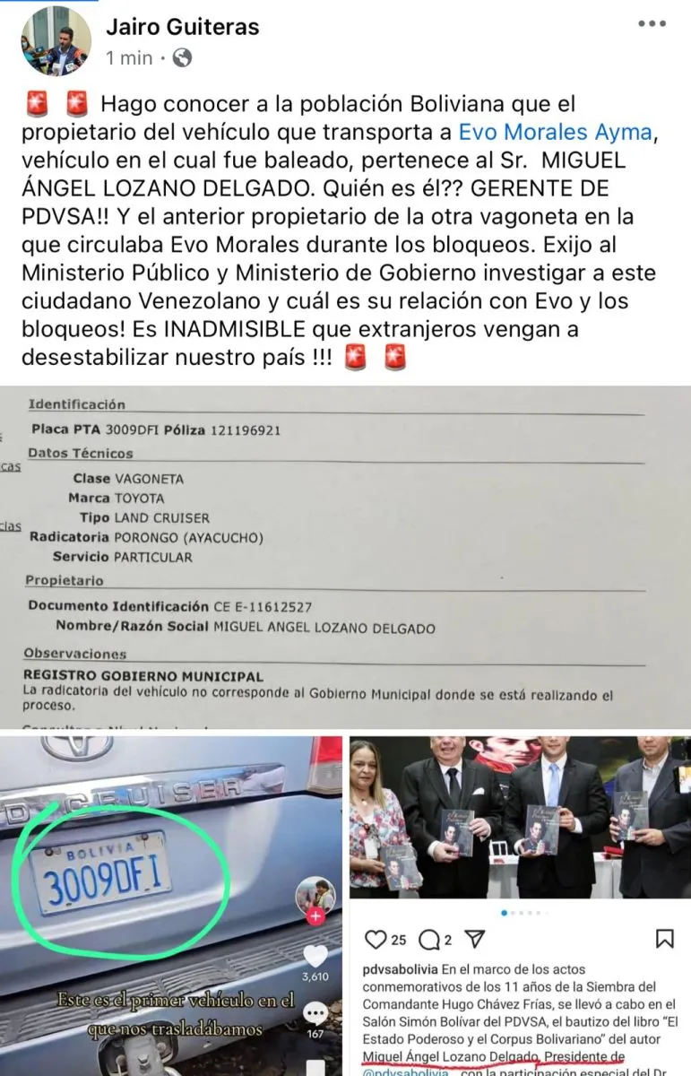 Uno de los vehículos utilizados la mañana del domingo por el expresidente Evo Morales, con placa N° 3009 DFI, pertenece al señor Miguel Ángel Lozano Delgado, presidente de la petrolera venezolana, Petróleos de Venezuela SA (PDVSA), según denunció el diputado de Comunidad Ciudadana (CC), Jairo Guiteras.