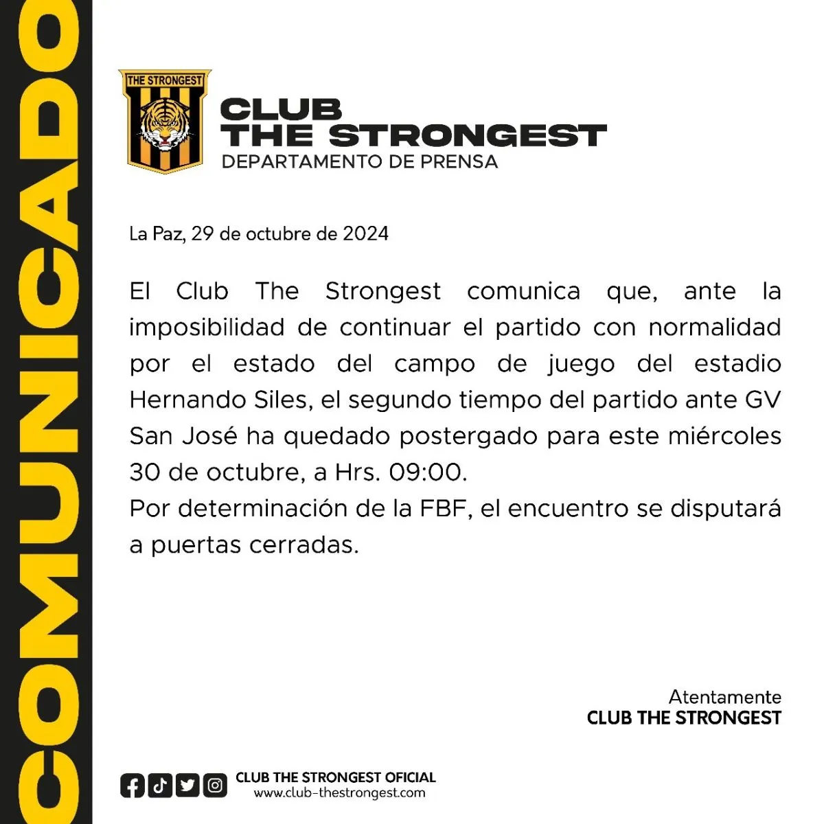 En un comunicado de prensa, la dirigencia del club The Strongest anunció que el segundo tiempo del cotejo entre el cuatro atigrado y GV San José, programado por la Federación Boliviana de Fútbol (FBF) para las 09.00 del miércoles, se disputará a puertas cerradas.