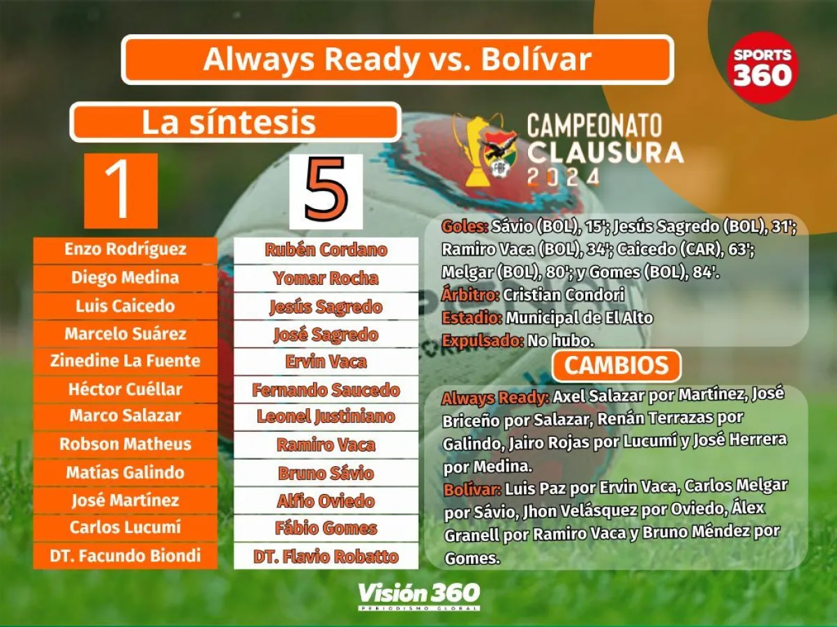 Contra todo pronóstico por la diferencia de goles que hubo, Bolívar no tuvo piedad de Always Ready y le venció por 1-5 para mantenerse firme en la cima del torneo Clausura, este miércoles en el estadio Municipal de El Alto por la jornada 21 del campeonato.
