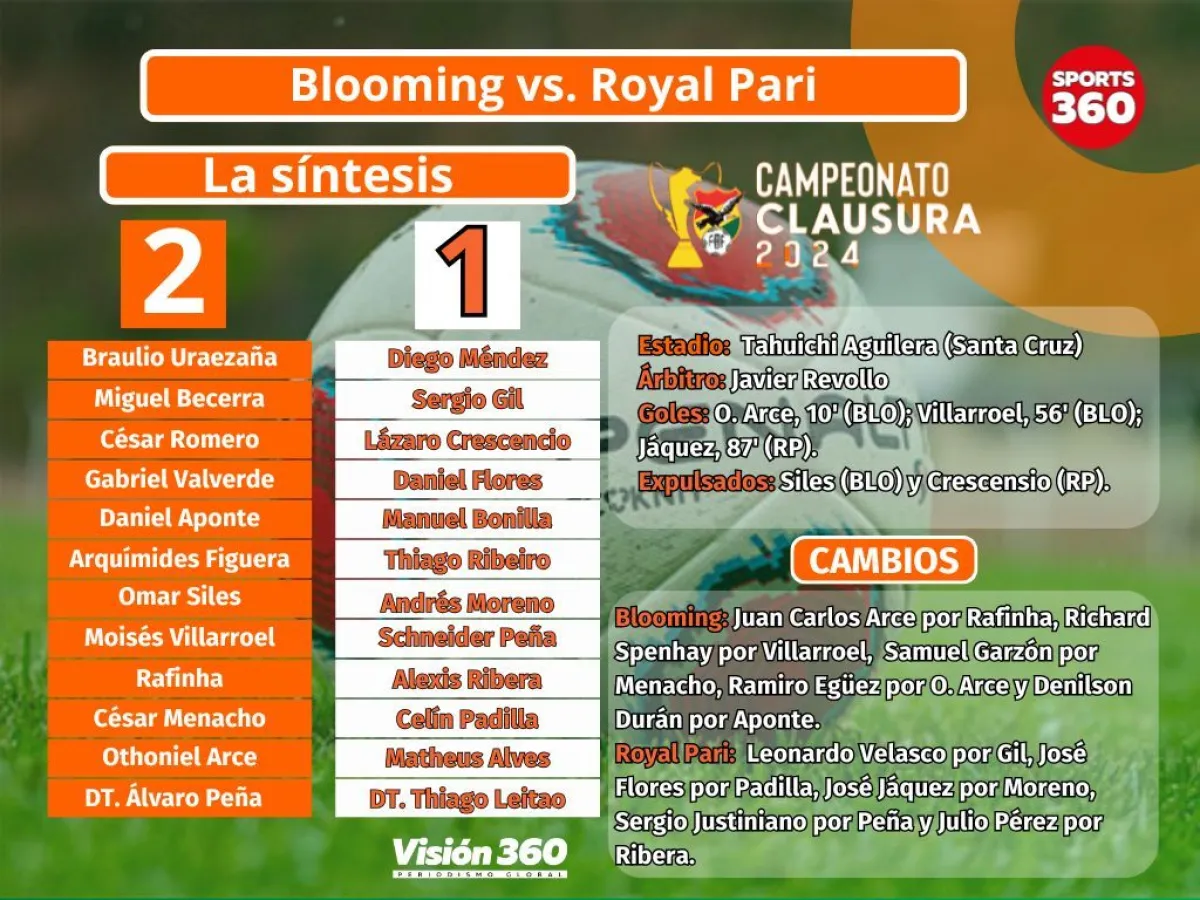 Los dos equipos terminaron con 10 hombres por las expulsiones de Omar Siles (Blooming) y Lázaro Crescencio (Royal Pari), ambos en la segunda parte y por doble tarjeta amarilla.