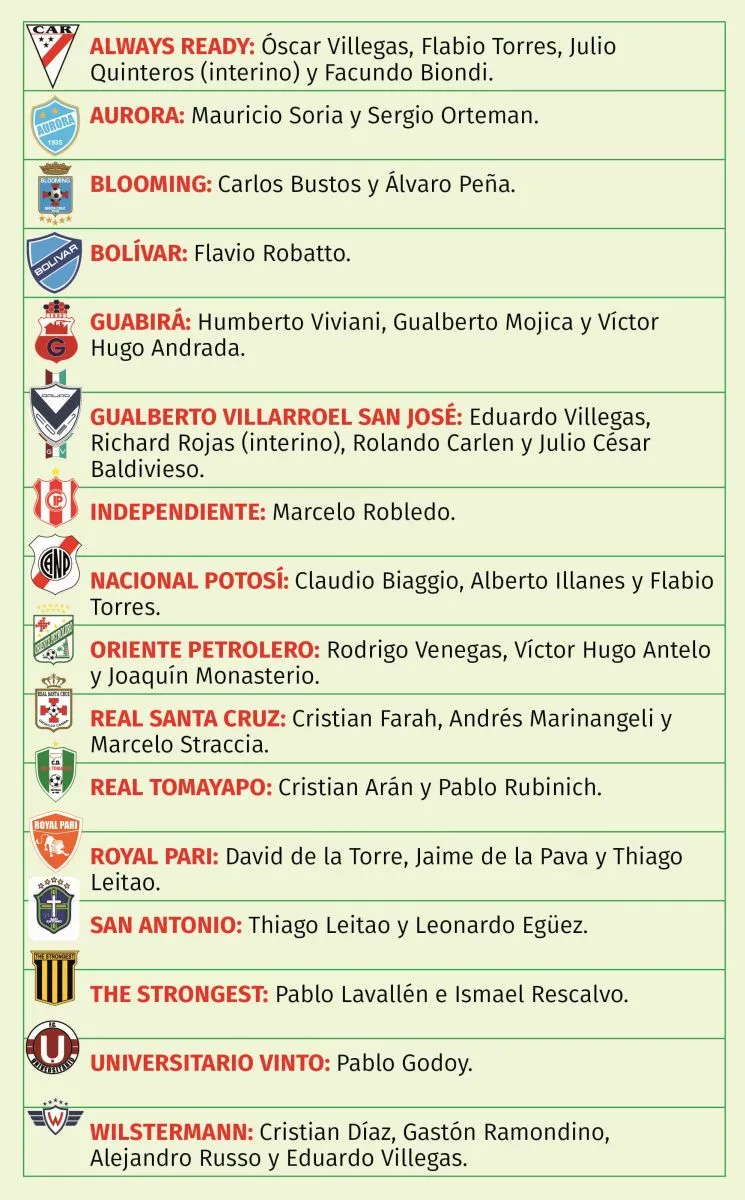 Solo tres clubes mantienen a sus entrenadores desde comienzo de año: Bolívar con Flavio Robatto, Independiente sigue con Marcelo Robledo y FC Universitario sostiene su apuesta por Pablo Godoy.