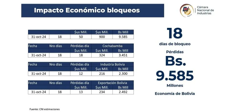 Tras 18 días de bloqueo de caminos y sin una solución en perspectiva, industriales y analistas advierten pérdidas económicas irreversibles, daños en sectores productivos e incertidumbre porque la gente ha comenzado a dejar de invertir y disminuye el consumo. Estos factores repercutirán en un menor crecimiento y alza de la inflación. Seguidores del expresidente Evo Morales iniciaron un bloqueo nacional de caminos, desde las 00.00 del lunes 14. El objetivo de la medida es defender a Morales del proceso que enfrenta un caso de trata y tráfico de personas y estupro agravado, al haber presuntamente procreado una hija con una menor de edad en 2016, piden suspender los procesos contra Morales, a lo que también sumaron el pedido por que se adelanten las elecciones y reclaman por el alza de los productos de la canasta familiar.