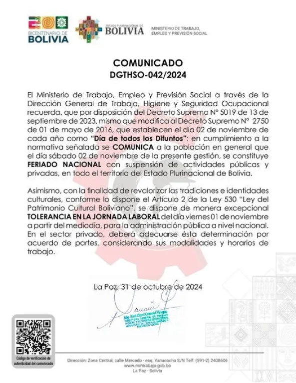 “El Ministerio de Trabajo, Empleo y Previsión Social a través de la Dirección General de Trabajo, Higiene y Seguridad Ocupacional recuerda, que por disposición del Decreto Supremo N° 5019 de 13 de septiembre de 2023, mismo que modifica al Decreto Supremo N° 2750 de 01 de mayo de 2016, que establecen el día 02 de noviembre de cada año como Día de todos los Difuntos; en cumplimiento a la normativa señalada se COMUNICA a la población en general que el día sábado 02 de noviembre de la presente gestión, se constituye FERIADO NACIONAL”. señala el documento.