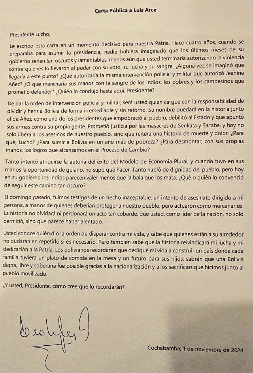 Cerró su carta con este texto: “Los bolivianos recordarán que dediqué mi vida a construir un país donde cada familia tuviera un plato de comida en la mesa y un futuro para sus hijas sabrán que una Bolivia digna, libre y soberana fue posible gracias a la nacionalización y a los sacrificios que hicimos junto al pueblo movilizado. ¿Y usted, presidente, cómo cree que lo recordarán?”.