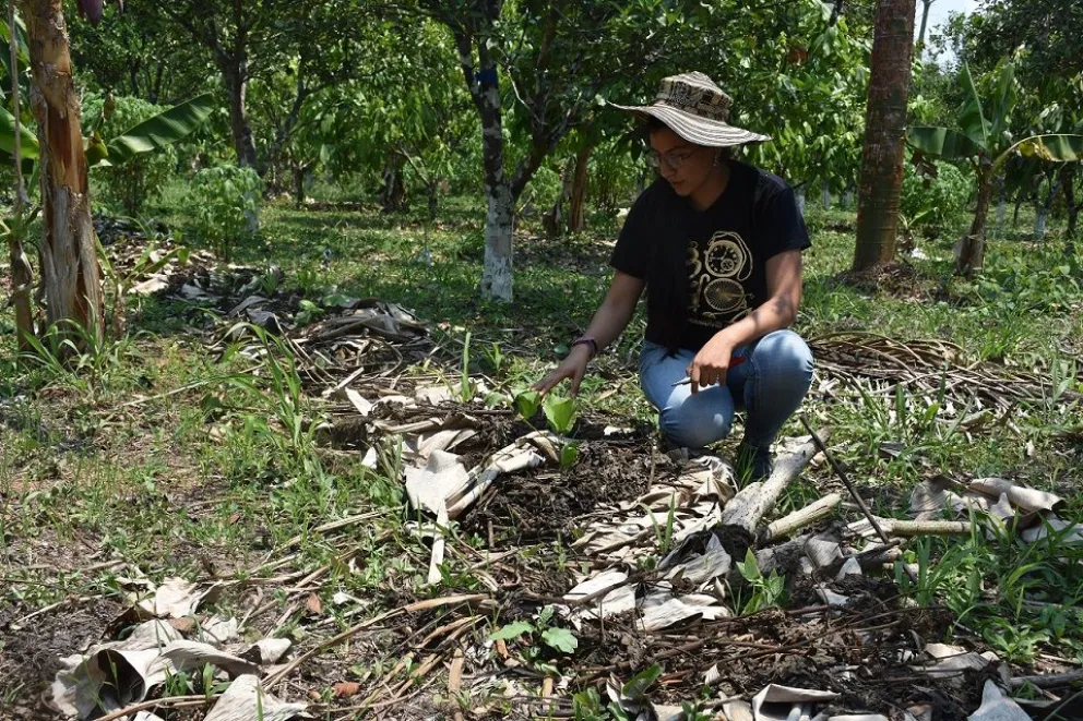 Carmen Guerra Rivas aplica los Sistemas Agro Forestales (Saf) en el terreno de su familia. Explica que su principal cultivo es el cacao, que dará frutos en tres años, pero cuida el suelo con otras plantas que le ayudan a cubrir la tierra, darle frescura, y así retener mejor la poca humedad de la temporada. Alegre, sostiene que la visitan animales como chanchos y monos, algunos de los cuales se comen sus yucas y pacay, pero lo justifica afirmando que al final este también es su territorio.