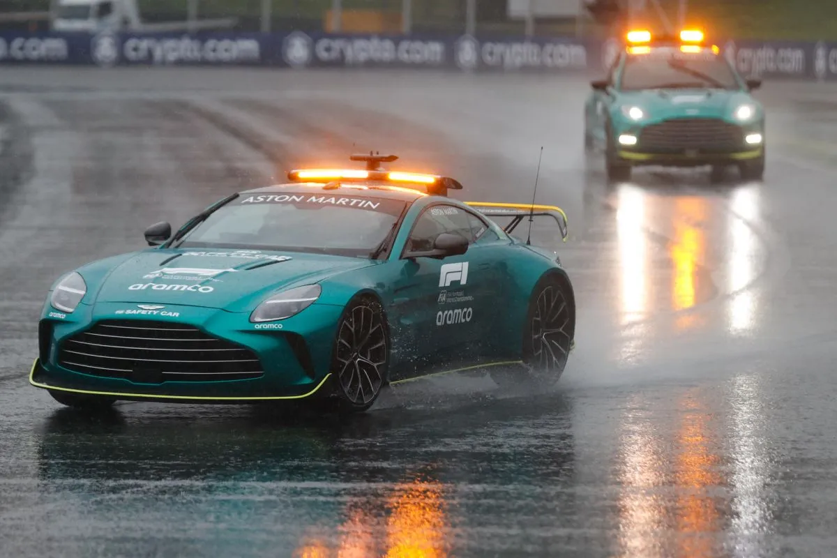 Los coches de seguridad recorren bajo la lluvia este sábado, el circuito del autódromo de Interlagos. Foto: EFE