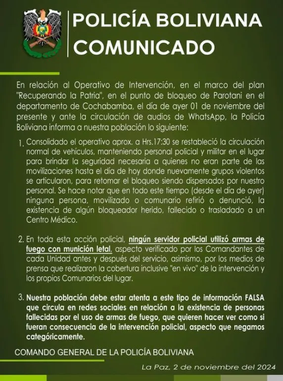 “Se hace notar que en todo este tiempo (desde el día de ayer) ninguna persona, movilizado o comunario refirió o denunció la existencia de algún bloqueador herido, fallecido o trasladado a un centro médico”, refiere otra parte del comunicado policial.