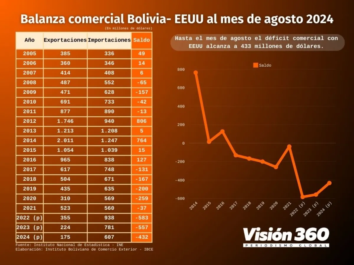 Bolivia hasta el mes de agosto registra un déficit comercial de 433 millones de dólares, es decir importa más de lo que exporta. En 2022 la balanza fue negativa en 583 millones de dólares y en 2023 de 557 millones de dólares, de acuerdo con datos del INE, procesados por el IBCE.