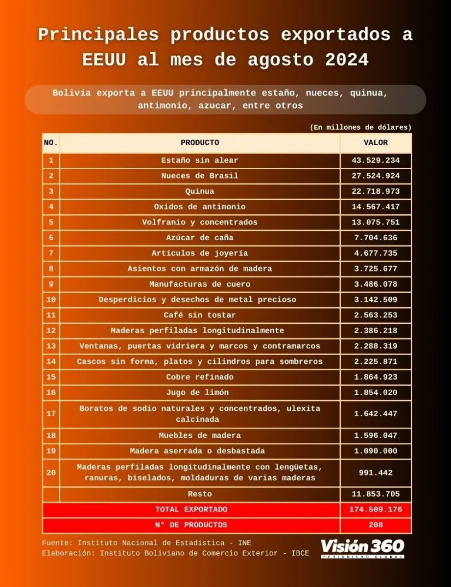 Bolivia exporta a EEUU principalmente estaño, nueces, quinua, antimonio, azúcar, entre otros. Importa desde ese país gasolina, diésel, polietileno, aceites lubricantes, vacunas de uso en veterinaria y en medicina humana, automóviles, turbinas de gas, maquinaria, entre otros.