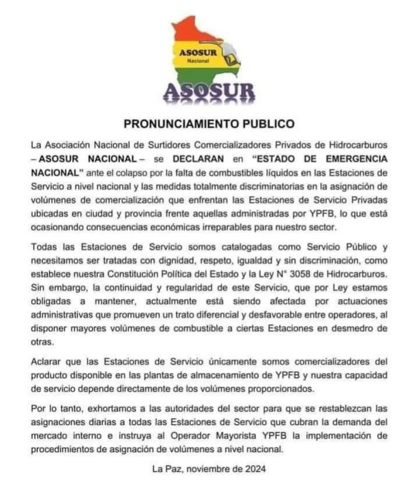 En el pronunciamiento, Asosur aclara: “las estaciones de servicio únicamente somos comercializadores del producto disponible en las plantas de almacenamiento de YPFB y nuestra capacidad de servicio depende directamente de los volúmenes proporcionados”.