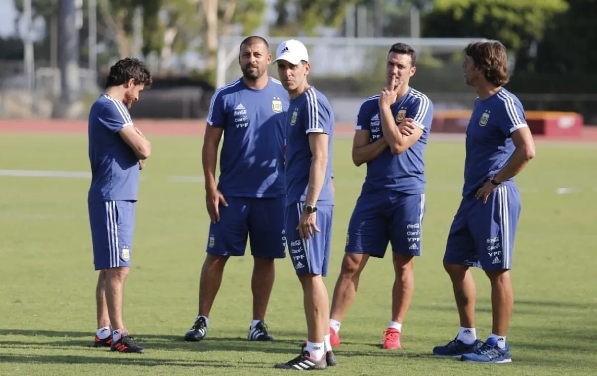 Lionel Scaloni (segundo desde la derecha) junto a sus colaboradores. Foto: AFA
