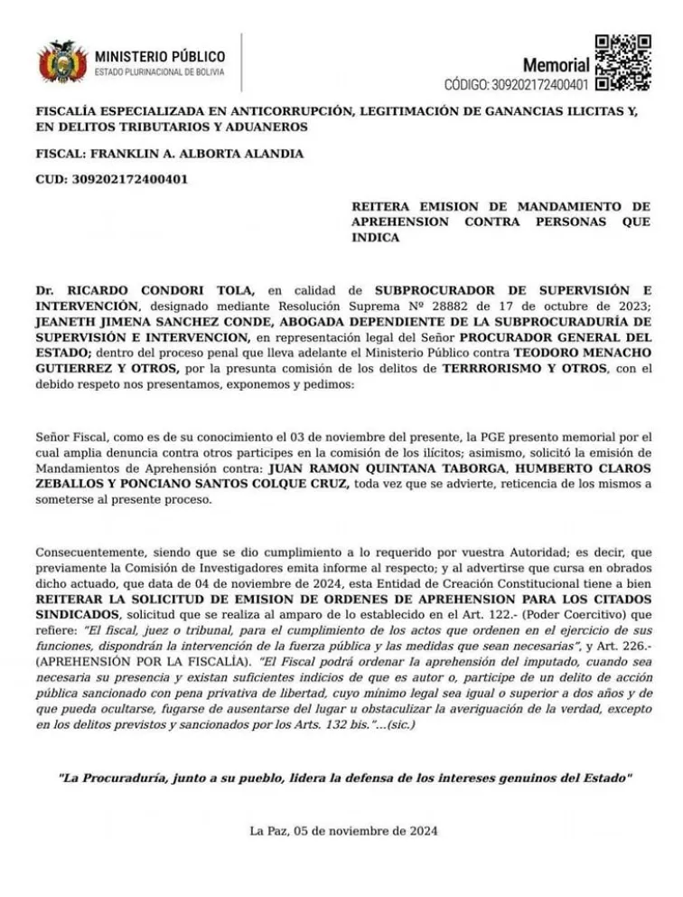 “Señor fiscal, como es de su conocimiento, el 3 de noviembre del presente, la PGE presentó memorial por el cual amplia denuncia contra otros partícipes en la comisión de los ilícitos; asimismo, solicitó la emisión de mandamientos de aprehensión contra: Juan Ramón Quintana Taborga, Humberto Claros Zeballos y Ponciano Santos Colque Crus, toda vez que se advierte, reticencia de los mismos a someterse al presente proceso”, dice parte del requerimiento.