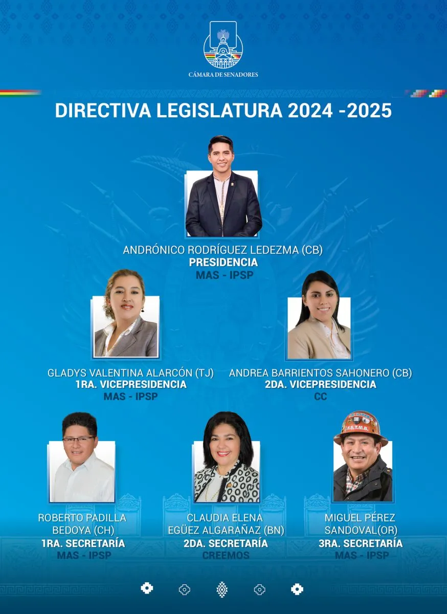 La directiva del Senado se completa de la siguiente forma: primera vicepresidenta, senadora Gladys Alarcón (MAS); segunda vicepresidenta, senadora Andrea Barrientos (CC); primer secretario, senador Roberto Padilla (MAS); segunda secretaria, Claudia Egüez (Creemos) y tercer secretario, senador Miguel Pérez (MAS).