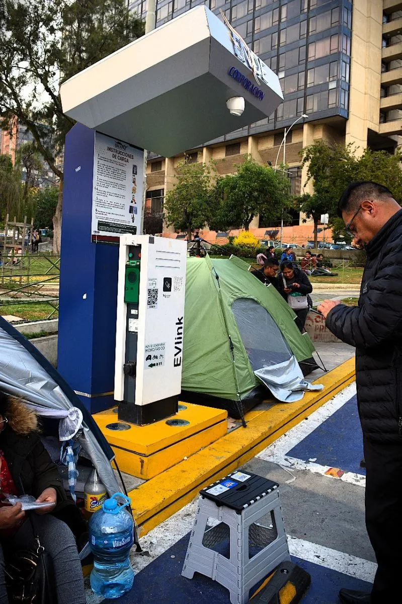 El punto de la plaza Bolivia tampoco tiene el enchufe de carga rápida, insumo con el que la mayoría de los vehículos no cuentan. Si bien este punto no está entre rejas, sí estaba inhabilitado por un grupo de manifestantes que hace días instalaron carpas en el lugar.