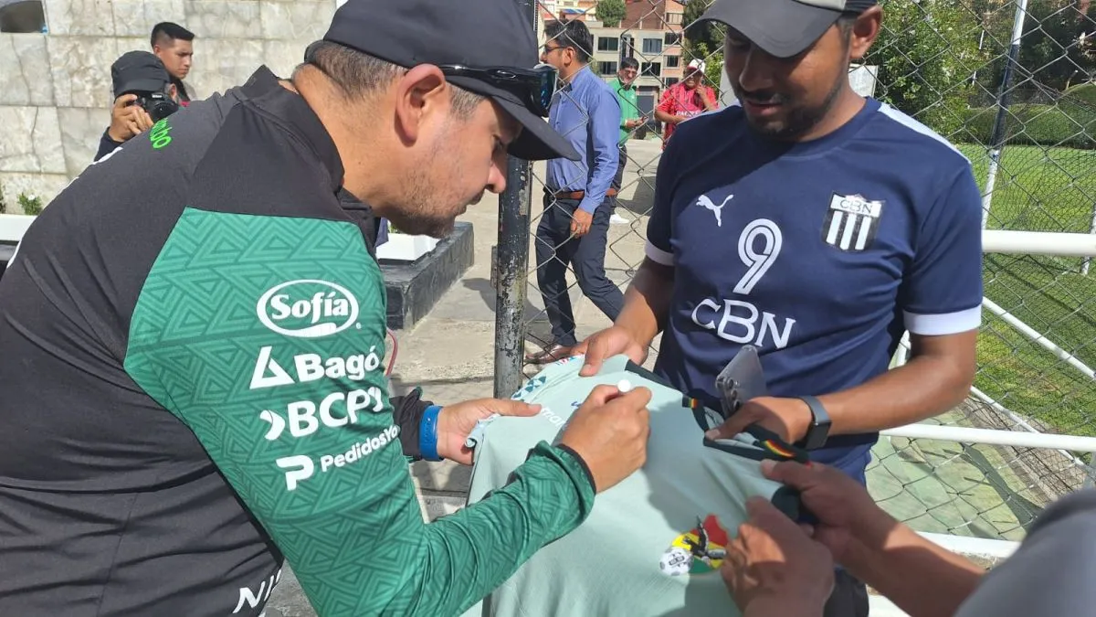 Óscar Villegas firma en una camiseta para un aficionado. Foto: Jorge Astrurizaga