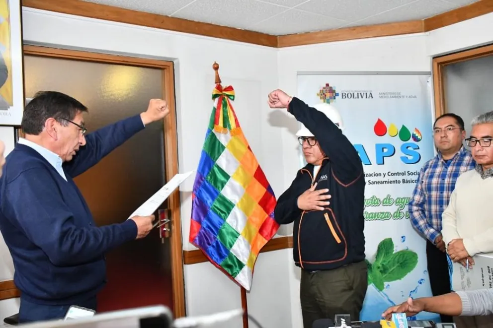 Alfredo Ayala, de casco blanco y haciendo al señal del MAS, en el juramento a su cargo. Foto: Epsas.