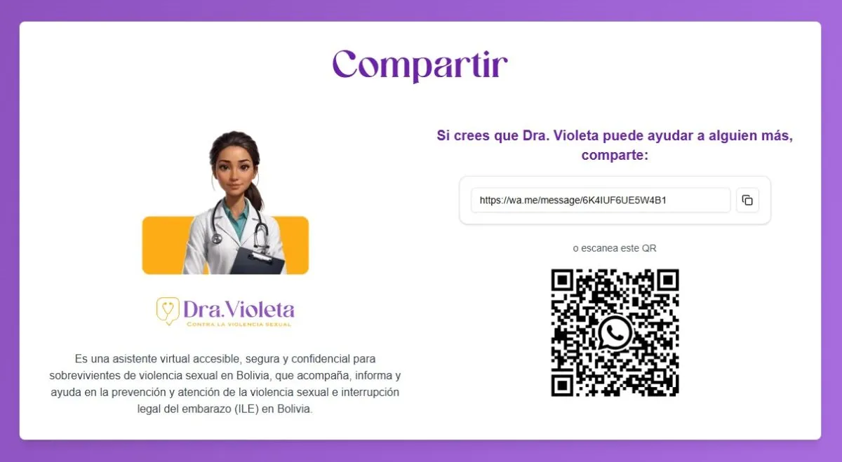 La Dra. Violeta es el primer chatbot de inteligencia artificial (IA) diseñado para asistir a mujeres y personas con capacidad de gestar sobrevivientes de violencia sexual en Bolivia. Esta herramienta busca ofrecer orientación inmediata y confidencial sobre cómo prevenir las consecuencias de una agresión sexual en la salud física, psicológica y emocional.
