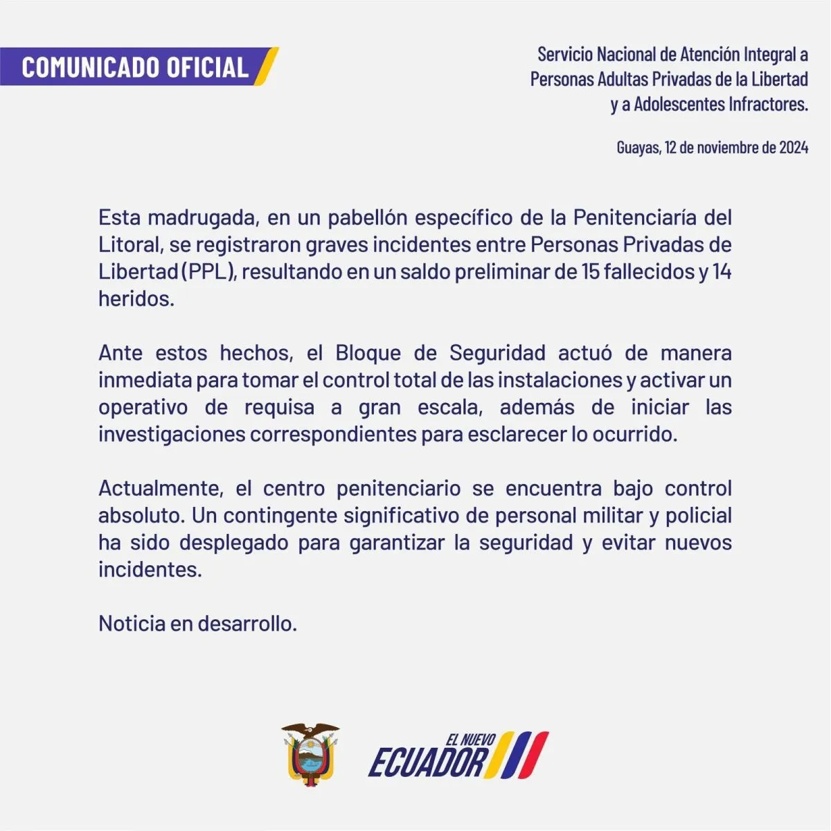 El Servicio Nacional de Atención Integral a Personas Privadas de Libertad (SNAI) -la unidad penitenciaria del Estado- señaló en un comunicado que el Bloque de Seguridad, compuesto por la Policía, las Fuerzas Armadas y los ministerios de Interior y Defensa, tiene al momento control absoluto del centro penitenciario donde, además, realizó un operativo de requisa "a gran escala".