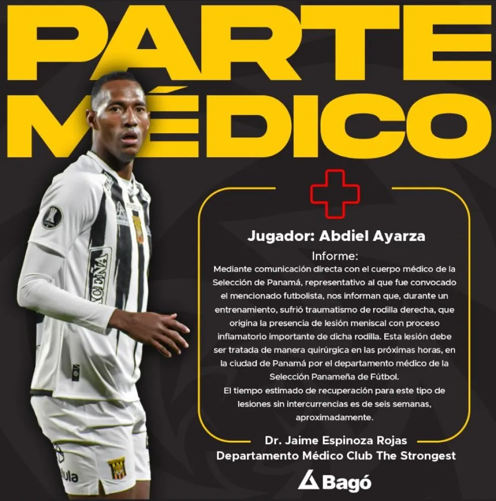 El club recibió el primer reporte de la Federación Panameña de Fútbol, que indica lesión de menisco externo y sinovitis reactiva producida el sábado 9 de noviembre.