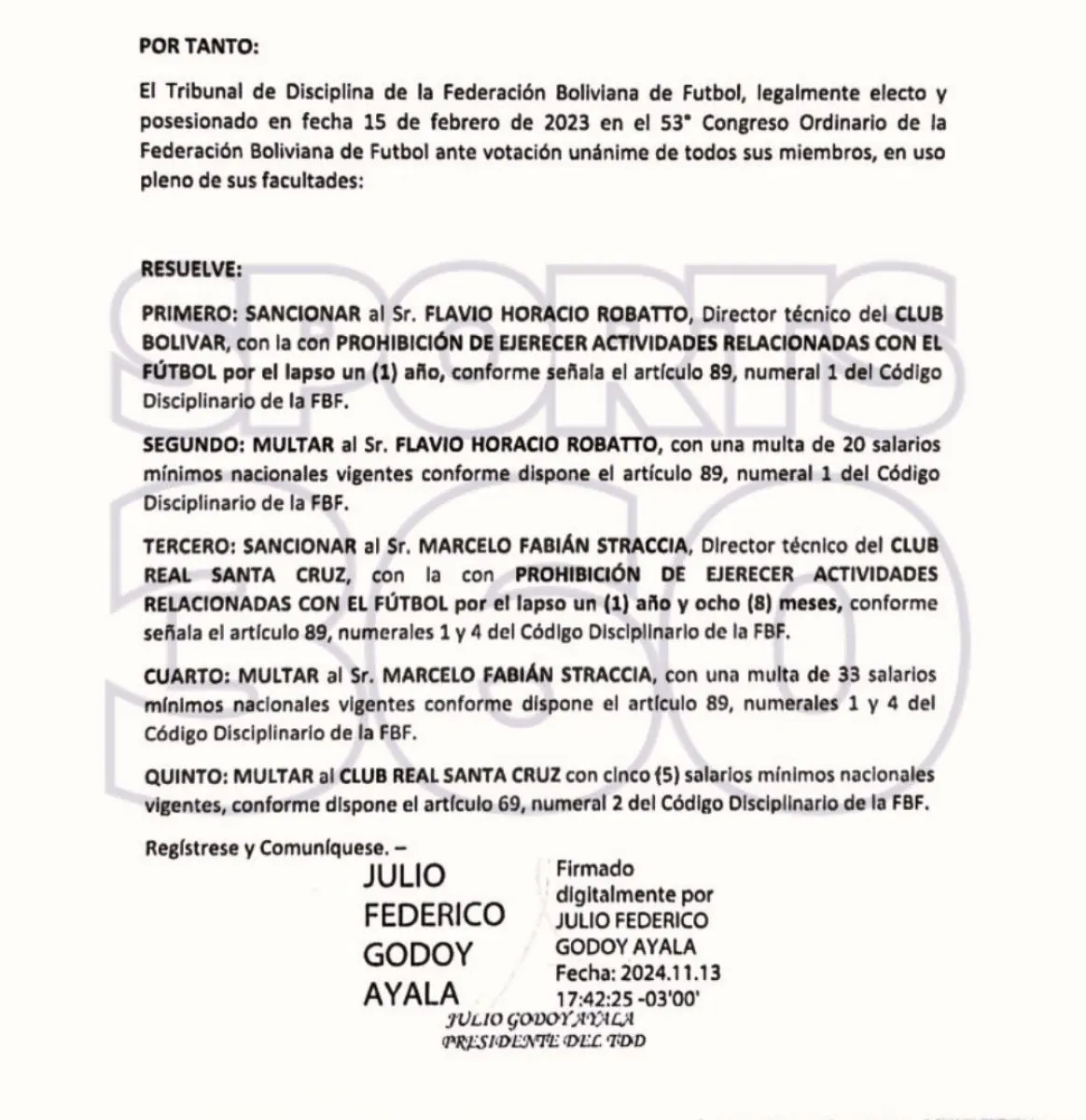 En su parte resolutiva el TDD menciona que se decidió “sancionar a Flavio Horacio Robatto, técnico del club Bolívar, con la prohibición de ejercer actividades relacionadas con el fútbol por el lapso de un año, conforme al artículo 89 del Código Disciplinario de la FBF.