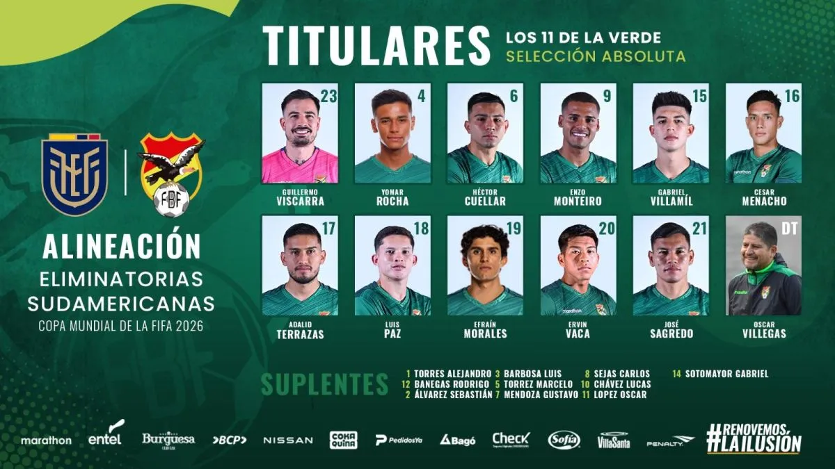 Unos minutos antes del inicio del partido con Ecuador —20.00 en Guayaquil— el técnico de la selección nacional Óscar Villegas confirmó la formación titular de Bolivia, la misma que probó en el entrenamiento del último  lunes en el estadio Rafael Mendoza de Achumani.