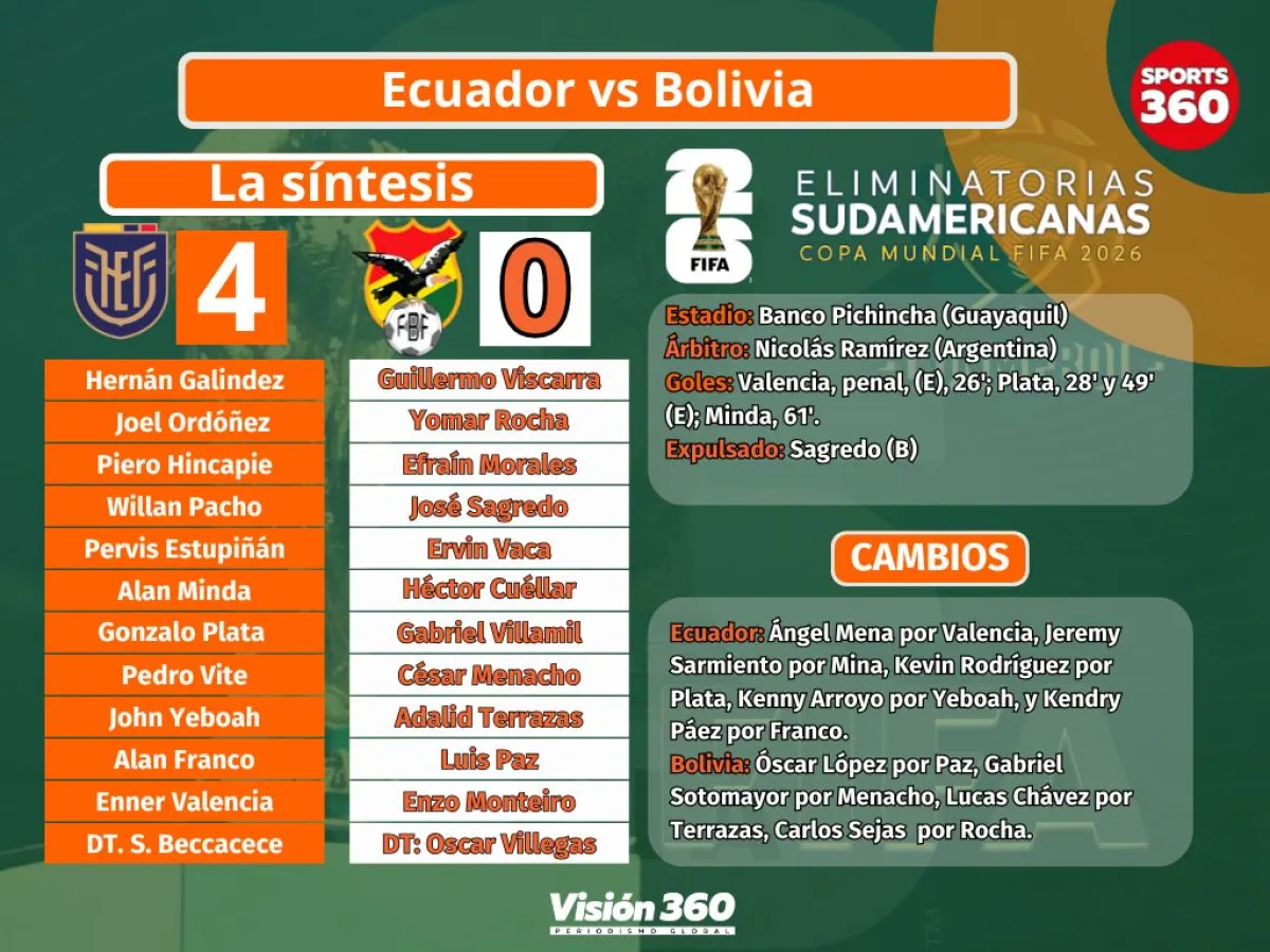 Bolivia aguantó solamente 26 minutos el incesante asedio de Ecuador y terminó goleada 4-0 este jueves en el estadio Banco Pichincha de Guayaquil, por la undécima jornada de las eliminatorias Mundial 2026.