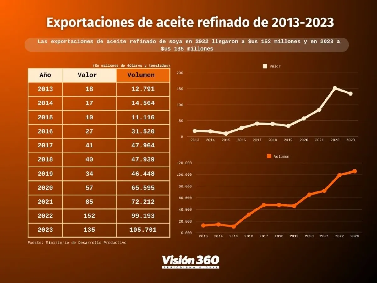 Los datos de esa cartera de Estado, revelan que en 2022 las exportaciones de aceite refinado de soya llegaron a 152 millones de dólares, por un volumen de 99.193 toneladas, mientras que en 2023 sumaron 135 millones de dólares y 105.701 toneladas.