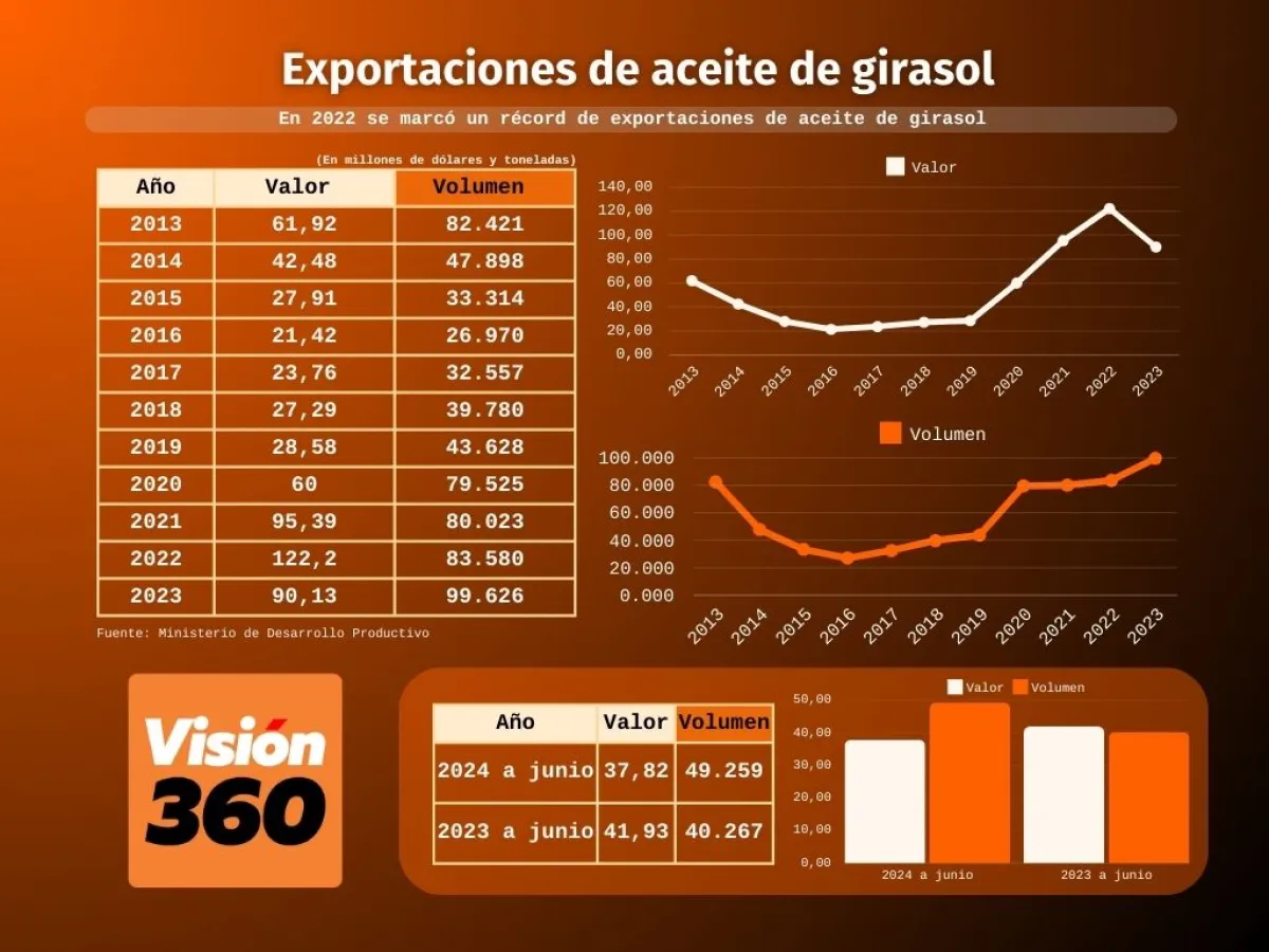 Las exportaciones de aceite de girasol en 2022 fueron de 122,2 millones de dólares, el año pasado bajaron a 90,1 y en el primer semestre de este año sumaron 37,82.