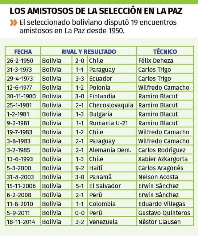 Ese partido tiene historias. Una es que después la Federación Boliviana de Fútbol (FBF) no ha podido trar a la sede de Gobierno a selecciones rivales, porque ellos no sacan  conclusiones positivas de jugar a gran altitud.