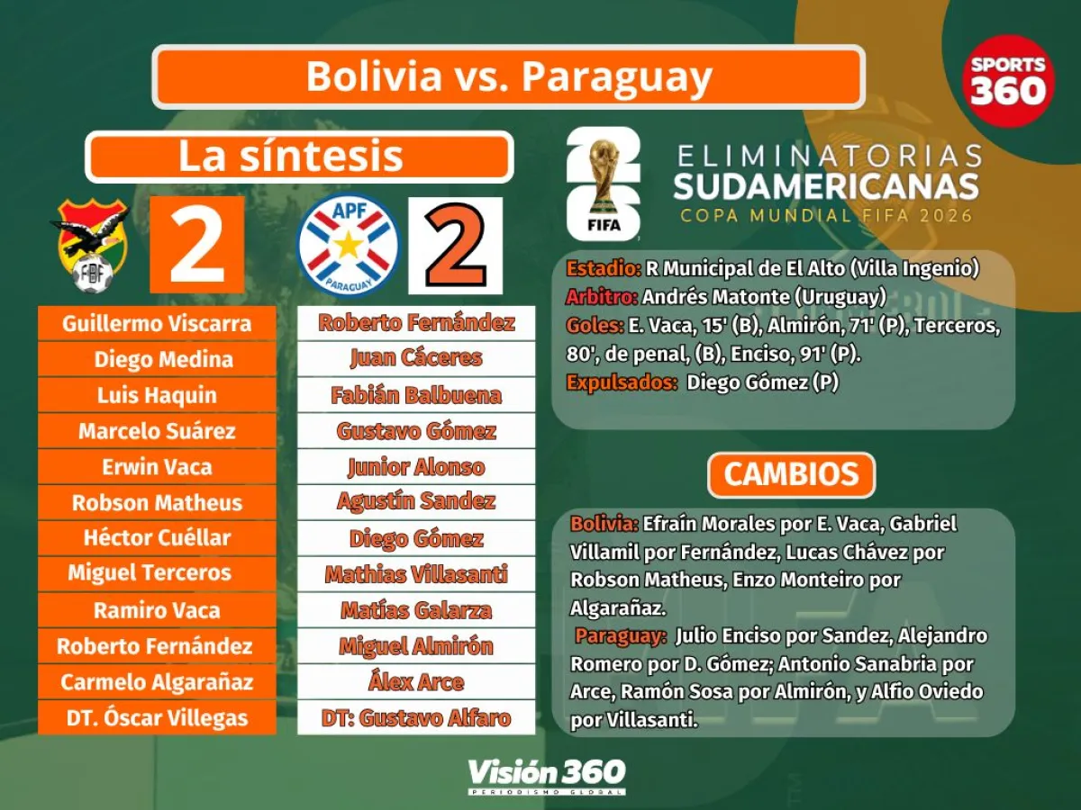El dulce del triunfo pasó rozando por los labios de Bolivia, pero se le escapó y termino resignando un empate (2-2) este martes en el estadio Municipal de El Alto, en Villa Ingenio, por la duodécima jornada de las eliminatorias sudamericanas Mundial 2026.