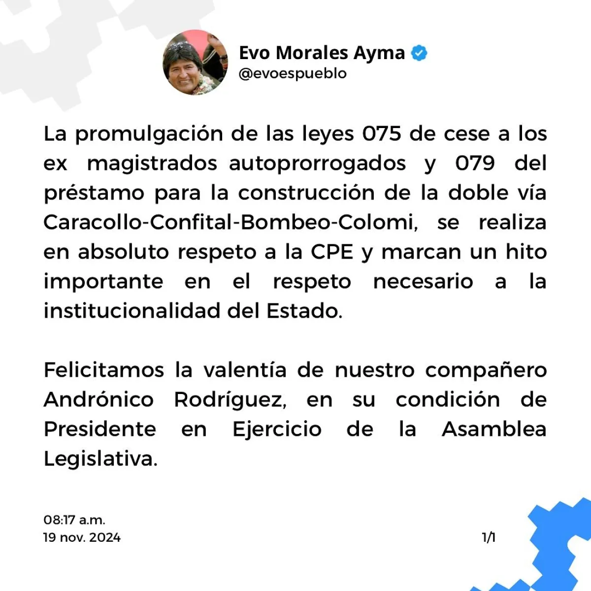 Según Morales, quien escribió en sus redes sociales, la promulgación de ambas normas se realizó en absoluto respeto a la Constitución Política del Estado (CPE).