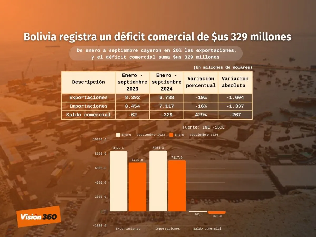 Entre enero y septiembre de 2024, las exportaciones totalizaron 6.788 millones de dólares, un 19% menos de lo registrado en el mismo período de la pasada gestión, por su parte las importaciones sumaron 7.117 millones de dólares, siendo 16% menos, dando como resultado un déficit comercial de 329 millones de dólares, señala el IBCE.
