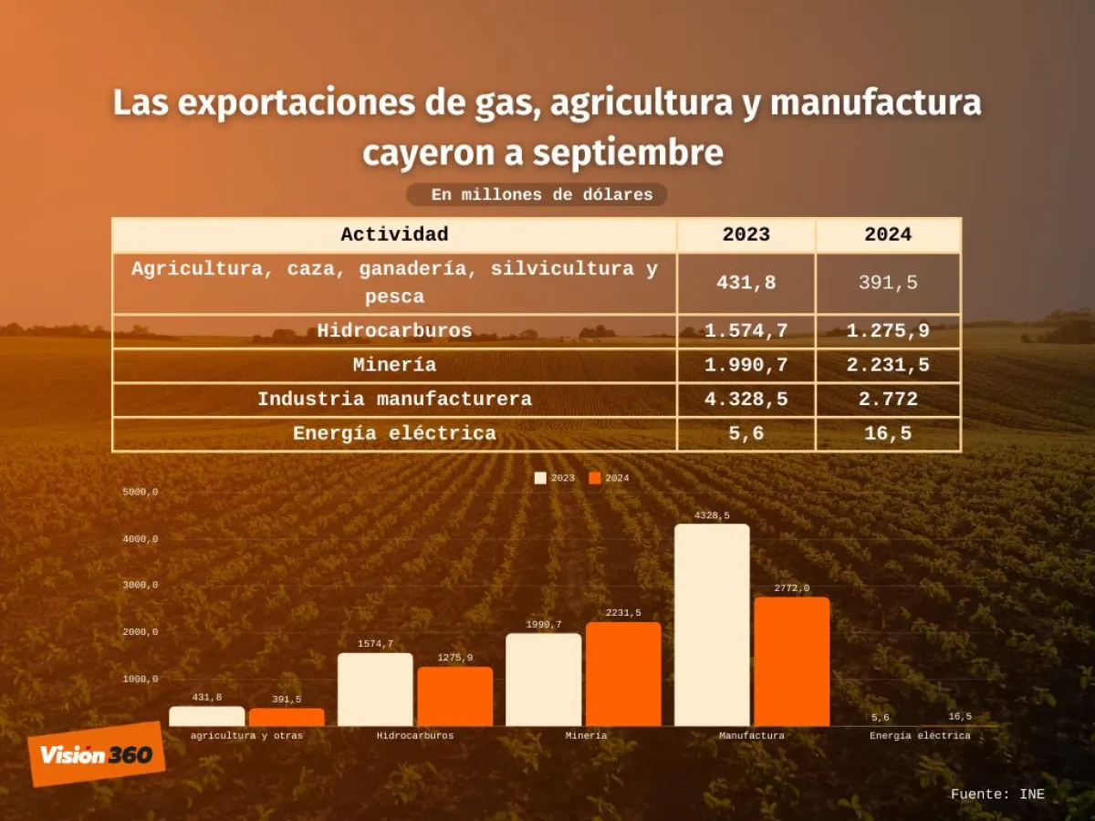 Añadió que, según un último reporte del INE, el valor de las exportaciones bolivianas hasta septiembre cayó en 19%, lo que en términos absolutos implica un menor ingreso de divisas por poco más de 1.600 millones de dólares, comparadas a igual período del año 2023.