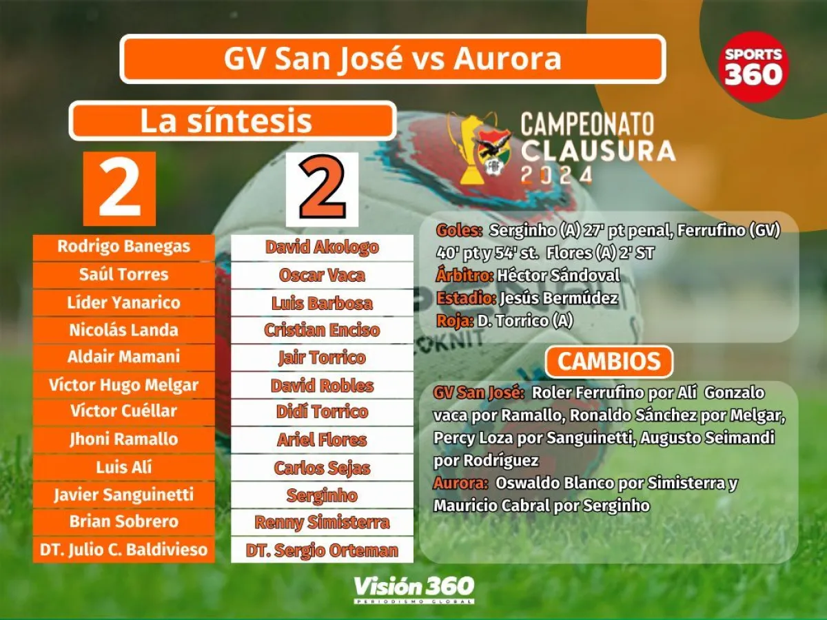 Aurora le puso un freno al camino victorioso que tenía GV San José con el que empató a dos goles por lado en partido disputado el estadio Jesús Bermúdez. Los orureños rescataron un punto en tiempo de adición, cuando todo hacía presumir que perderían en su terreno.
