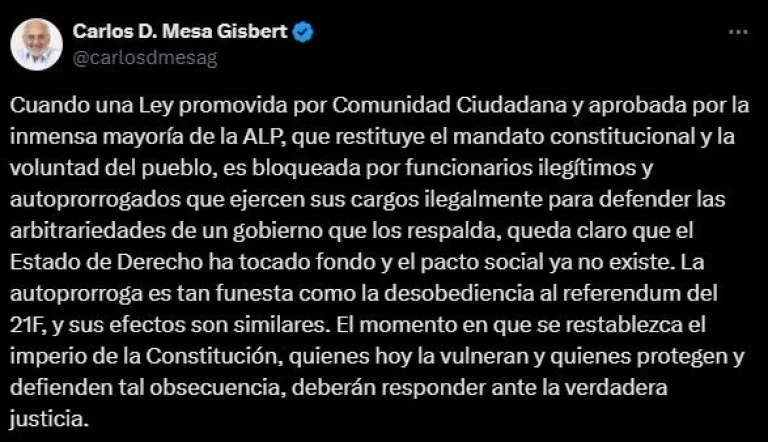 Para Mesa, cuando una ley, promovida por CC y aprobada por la inmensa mayoría de la Asamblea Legislativa Plurinacional (ALP), que restituye el mandato constitucional y la voluntad del pueblo, es bloqueada por funcionarios ilegítimos y autoprorrogados que ejercen sus cargos ilegalmente para defender las arbitrariedades de un gobierno que los respalda, queda claro que el Estado de Derecho ha tocado fondo y el pacto social ya no existe.