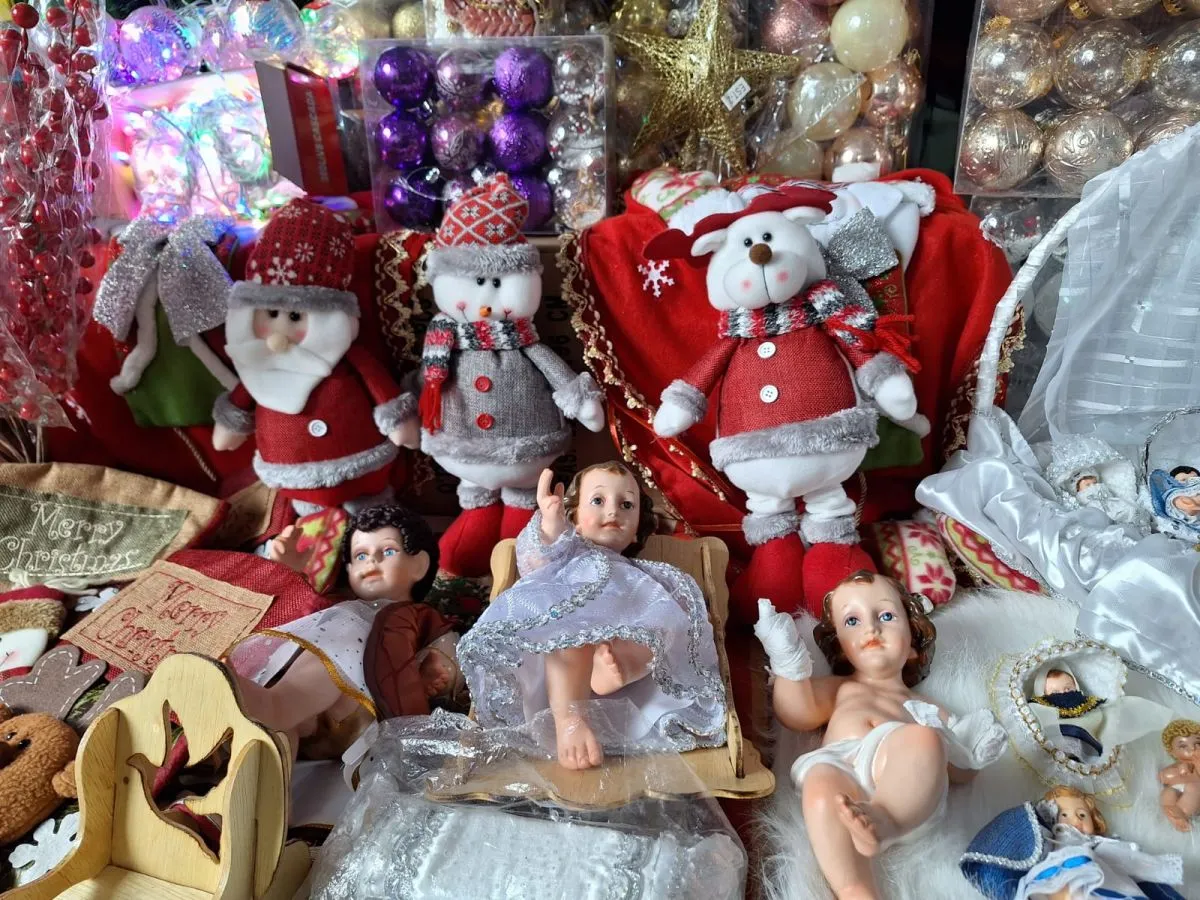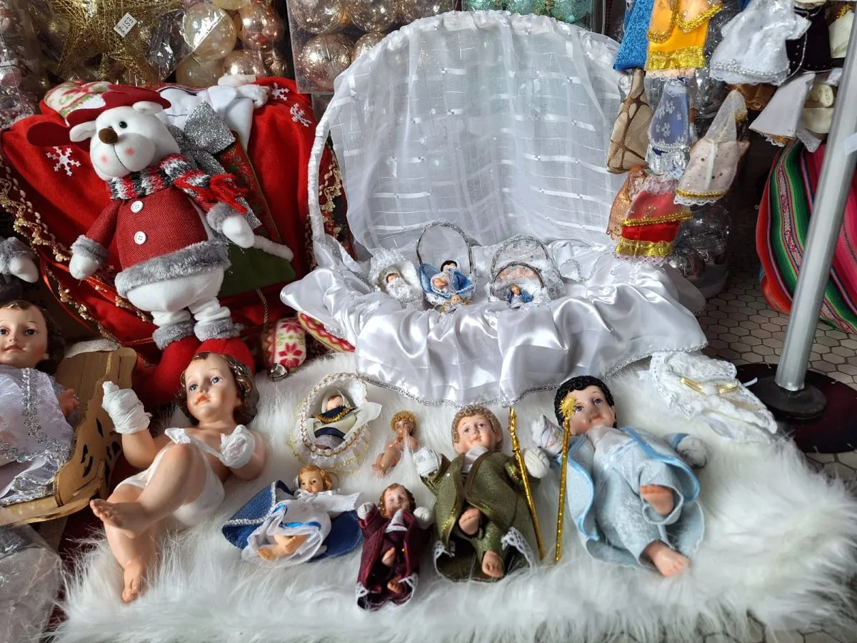 Las vendedoras de sector Huarina Media Luna San José ofrecen al público adornos, focos, niños Jesús y ropa del niño en diferentes colores, variedades y tamaños.