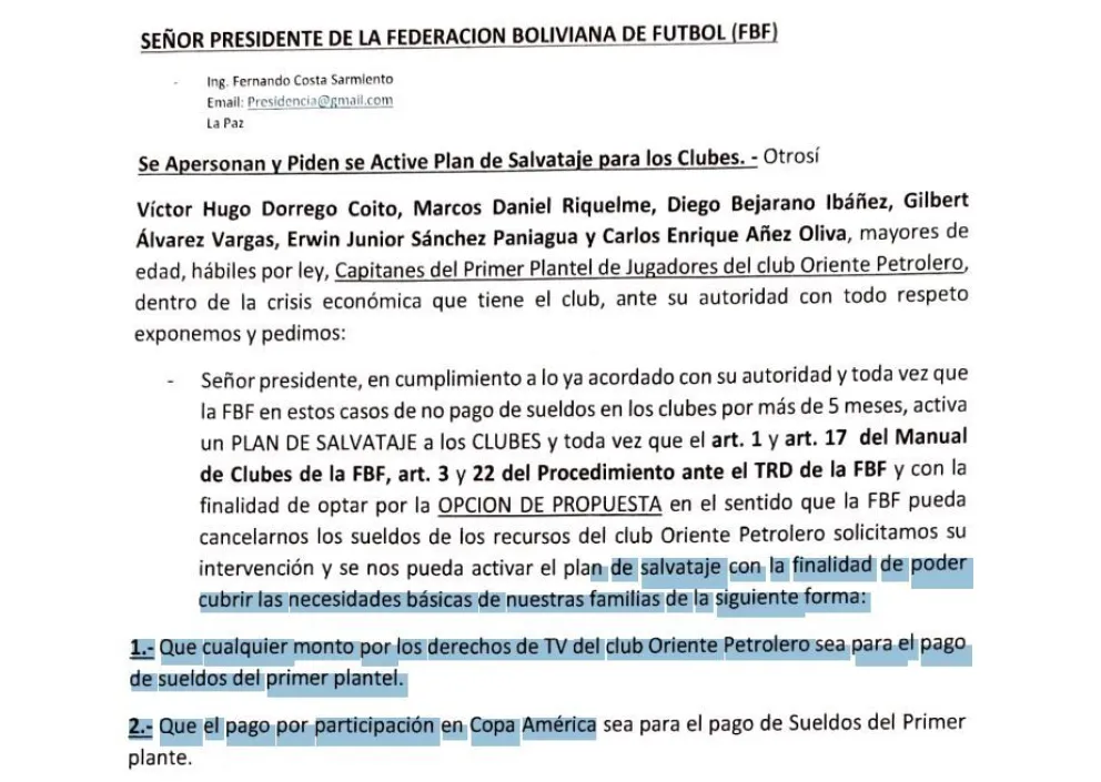 “En cumplimiento a lo ya acordado con su autoridad y toda vez que la FBF en estos casos de no pago de sueldos en los clubes por más de 5 meses, activa un plan de salvataje a los clubes y toda vez que el art. 1 y art. 17 del Manual de Clubes de la FBF, art. 3 y 22 del Procedimiento ante el TRD de la FBF y con la finalidad de optar por la opción de propuesta en el sentido que la FBF pueda cancelarnos los sueldos de los recursos del club Oriente Petrolero solicitamos su intervención y se nos pueda activar el plan de salvataje con la finalidad de poder cubrir las necesidades básicas de nuestras familias”, cita el documento.
