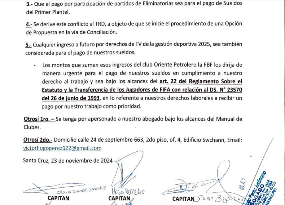 “Los montos que sumen esos ingresos del club Oriente Petrolero la FBF los dirija de manera urgente para el pago de nuestros sueldos en cumplimiento a nuestro derecho al trabajo y sea bajo los alcances del art. 22 del Reglamento Sobre el Estatuto y la Transferencia de los Jugadores de FIFA con relación al DS. N° 23570 del 26 de junio de 1993, en lo referente a nuestros derechos laborales a recibir un pago por nuestro trabajo como prioridad”, agrega la nota que en su parte final es firmada por los jugadores Diego Bejarano, Marcos Riquelme, Erwin Sánchez, Víctor Hugo Dorrego y Sebastián Ramírez.