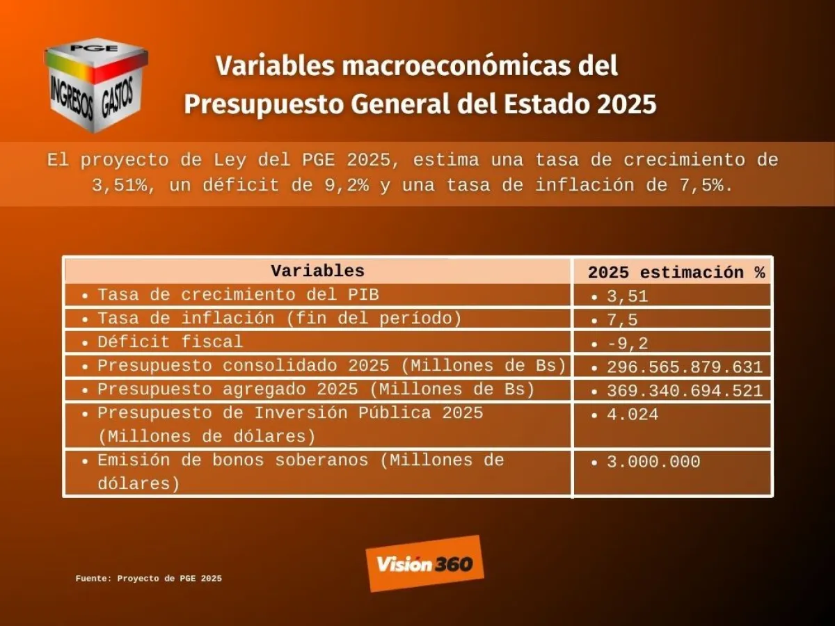 El proyecto de Ley del Presupuesto General del Estado (PGE) 2025 al que accedió Visión 360, proyecta un crecimiento económico de 3,51%, un déficit fiscal de 9,2% del PIB y una tasa de inflación de 7,5% el próximo año. Se garantiza la subvención a hidrocarburos y alimentos.