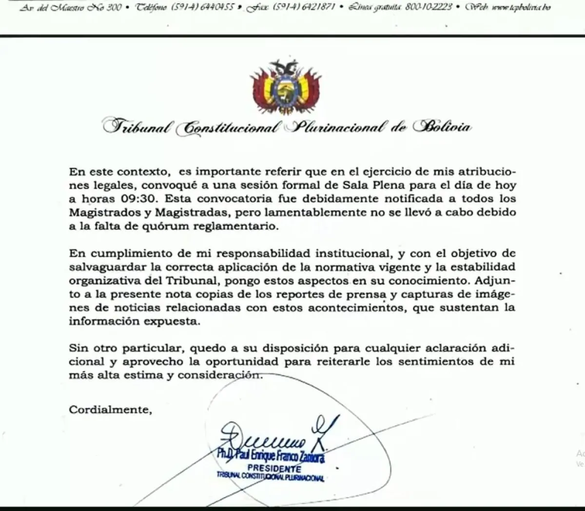 El ministro de Justicia, César Siles, informó este martes que el Gobierno recibió una nota del presidente depuesto del Tribunal Constitucional Plurinacional (TCP), Paul Franco, en la que denuncia las irregularidades cometidas en el nombramiento de Gonzalo Hurtado, que fue designado para sucederlo en el cargo.