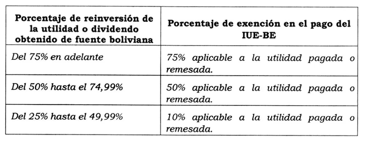El artículo 10, sobre incentivo a la reinversión de utilidades, señala en su parágrafo I: “Los socios y accionistas de las empresas domiciliadas en el país y de sucursales de compañías extranjeras que reinviertan total o parcialmente sus utilidades o dividendos obtenidos en el Estado Plurinacional de Bolivia, estarán exentos del pago del Impuesto sobre las Utilidades de las Empresas - Beneficiarios del Exterior (IUE-BE)”.
