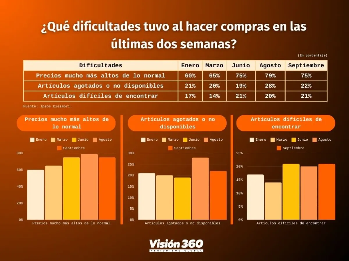 "¿Qué dificultades tuvo al hacer comprar en las últimas dos semanas?", fue la pregunta formulada.  Un 76% respondió que encontró precios más altos de los normal, aunque en agosto un 79% pensaba lo mismo. En enero, solo el 60% de encuestado tenía esa sensación de precios más elevados. "La sensación de alza en los precios es más frecuente entre los consumidores, pasó de 60% en enero a 79% en agosto y 75% en septiembre", precisa el informe.