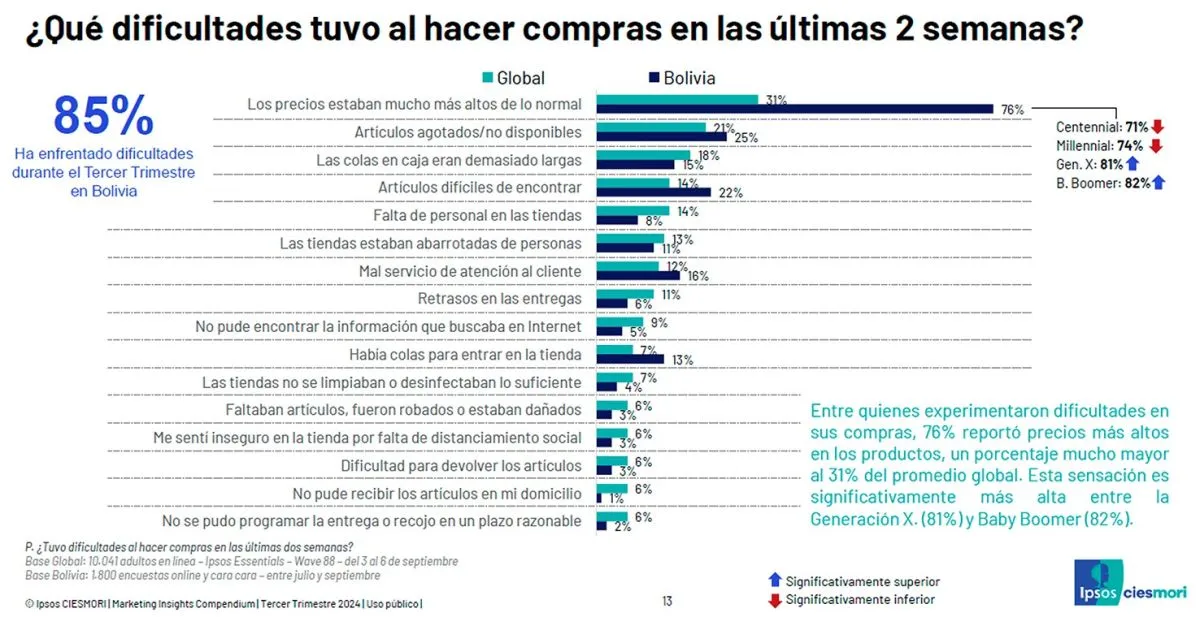 En general, los resultados de la encuesta revelan que el 85% de la población ha encontrado dificultades durante el tercer trimestre en Bolivia.