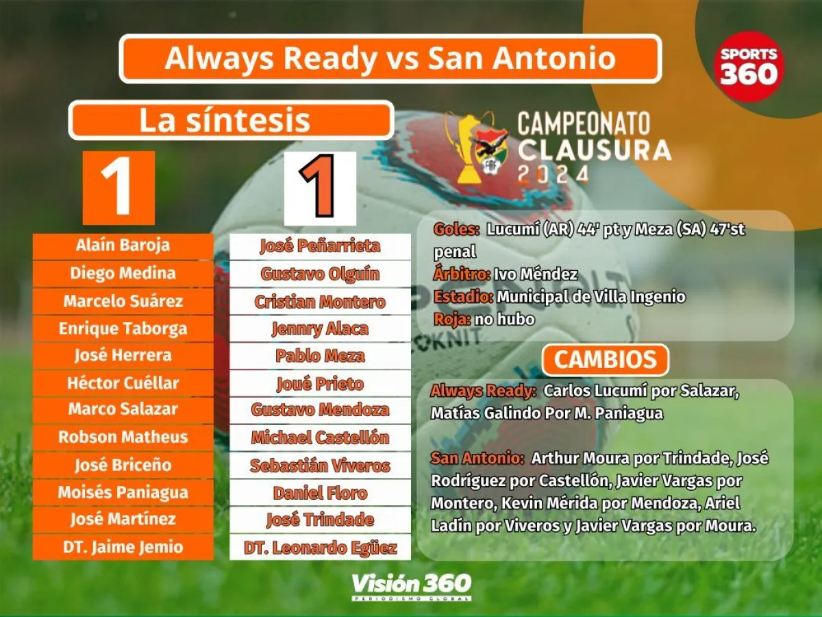 Always Ready desperdició la oportunidad de acercarse a zona de clasificación al igualar este viernes a un gol por lado con San Antonio de Bulo BUlo, en partido que se disputó en el estadio Municipal de Villa Ingenio, en el inicio de la fecha 24.