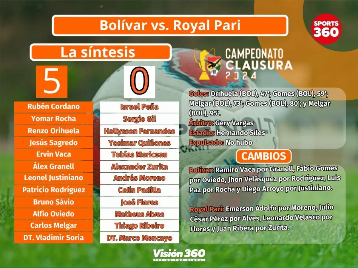 Bolívar se repuso de la derrota que sufrió en Oruro con GV San José (3-2) al golear este sábado a Royal Pari (5-0) en el estadio Hernando Siles por la jornada 24 del torneo Clausura.