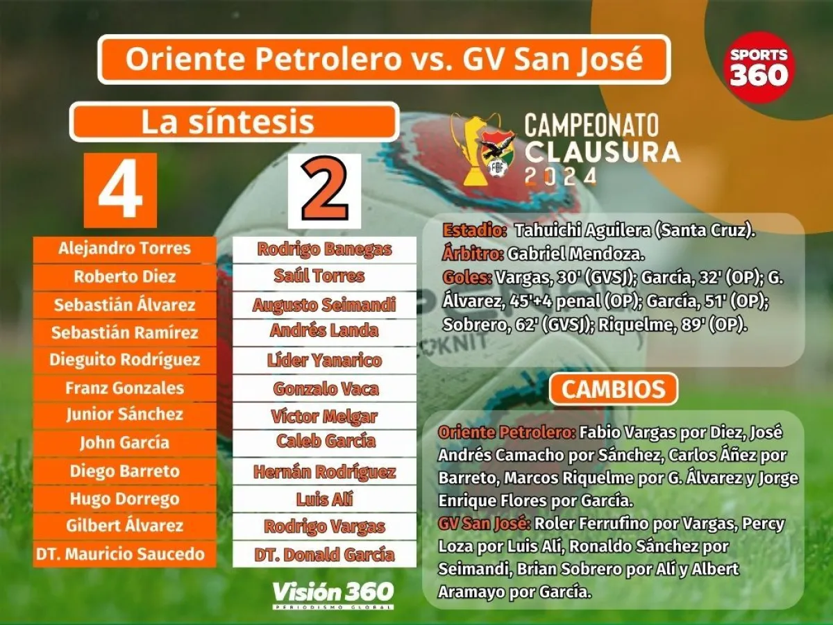 Oriente Petrolero se acordó de ganar y, después de seis partidos (cuatro derrotas y dos empates), volvió a sumar de a tres después de superar a GV San José por 4 a 2, partido que se jugó este domingo por la noche en el estadio Tahuichi Aguilera de Santa Cruz, con el que finalizó la jornada 24 del torneo de la División Profesional.