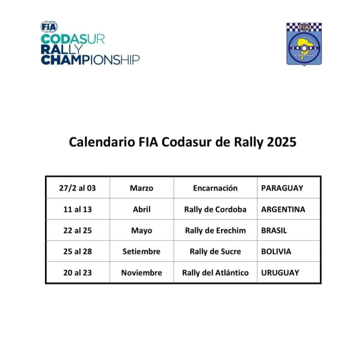 Sucre en vez de Santa Cruz. Con ese cambio, la Confederación Deportiva Automovilística Sudamericana (Codasur) presentó este miércoles el “Calendario 2025 Provisorio” del Campeonato Sudamericano de Rally, que deberá ser aprobado por la Federación Internacional de Automovilismo (FIA) durante una asamblea.